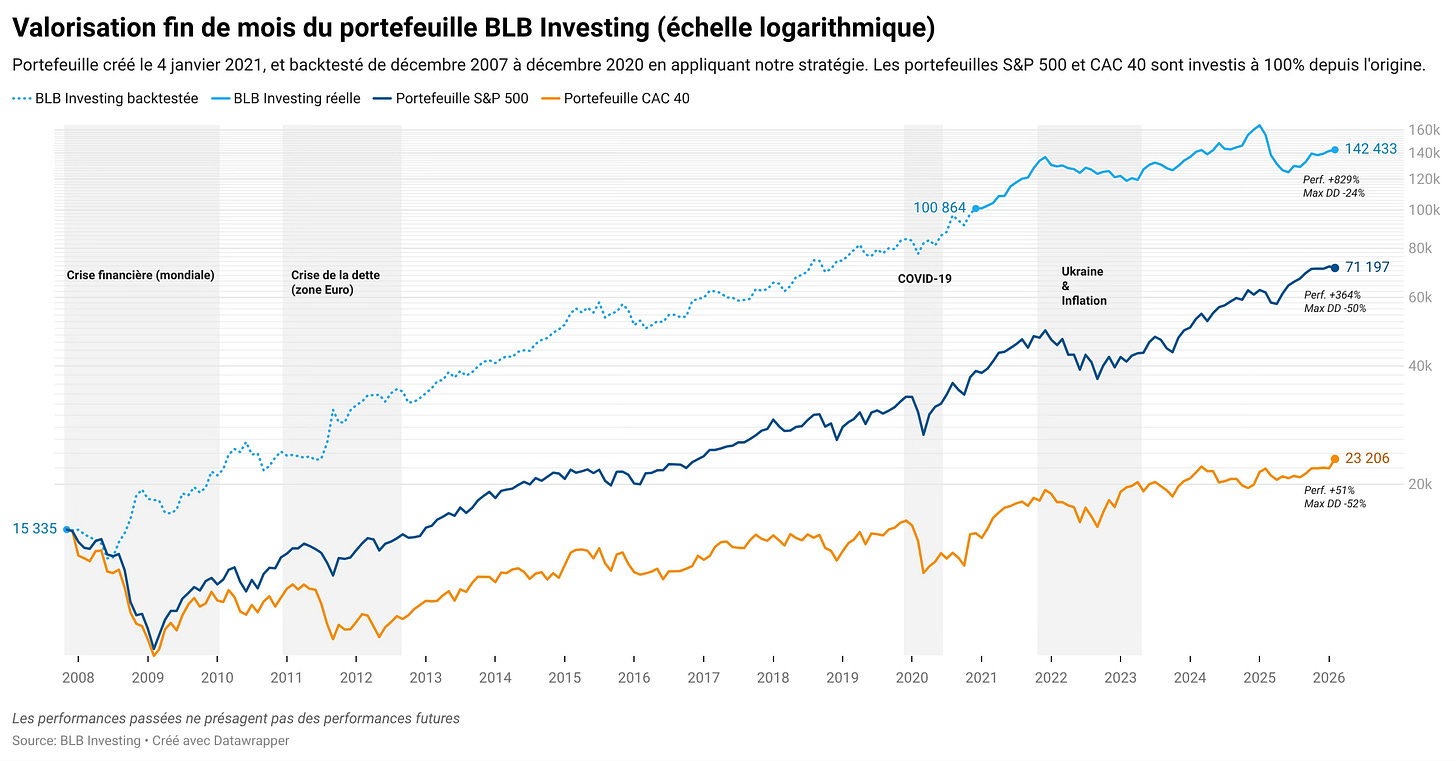 Notre stratégie de gestion continue de porter ses fruits. Au 27 février 2026, la valorisation du portefeuille BLB Investing atteint 142 433 €, affichant une performance historique de +829 % depuis 2008, loin devant le S&P 500 (+364 %) et le CAC 40 (+51 %).